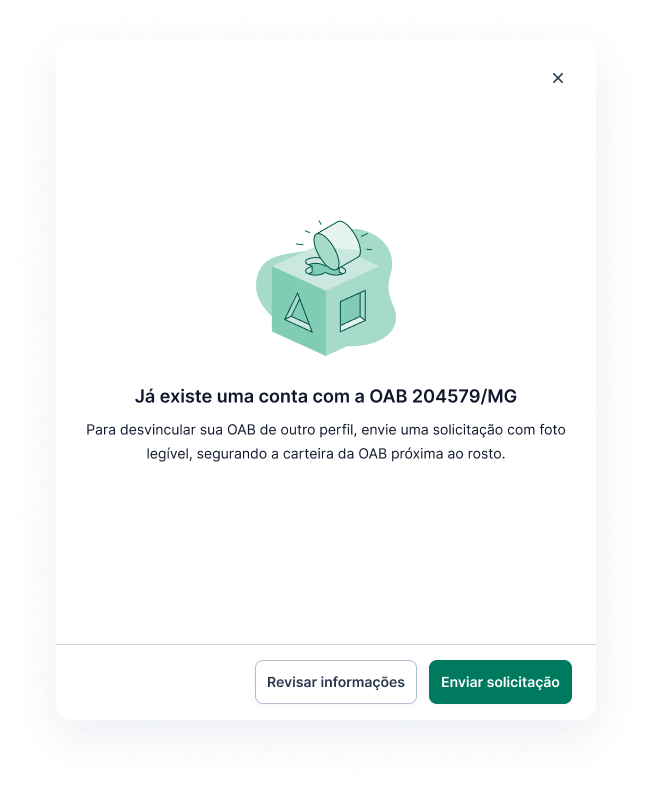 Cada OAB pode estar validada apenas em um perfil e assinatura. Se a sua OAB ou CPF já estiverem vinculados a outra conta, será exibido um aviso com a conta associada.