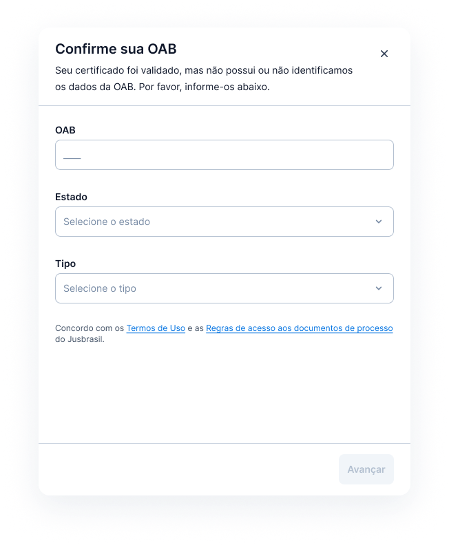 Não tem problema. O Jusbrasil vai pedir as informações da sua OAB após validar a sua identidade via Certificado Digital. Basta seguir e informar o número da OAB, o Estado e o Tipo para concluir a validação.